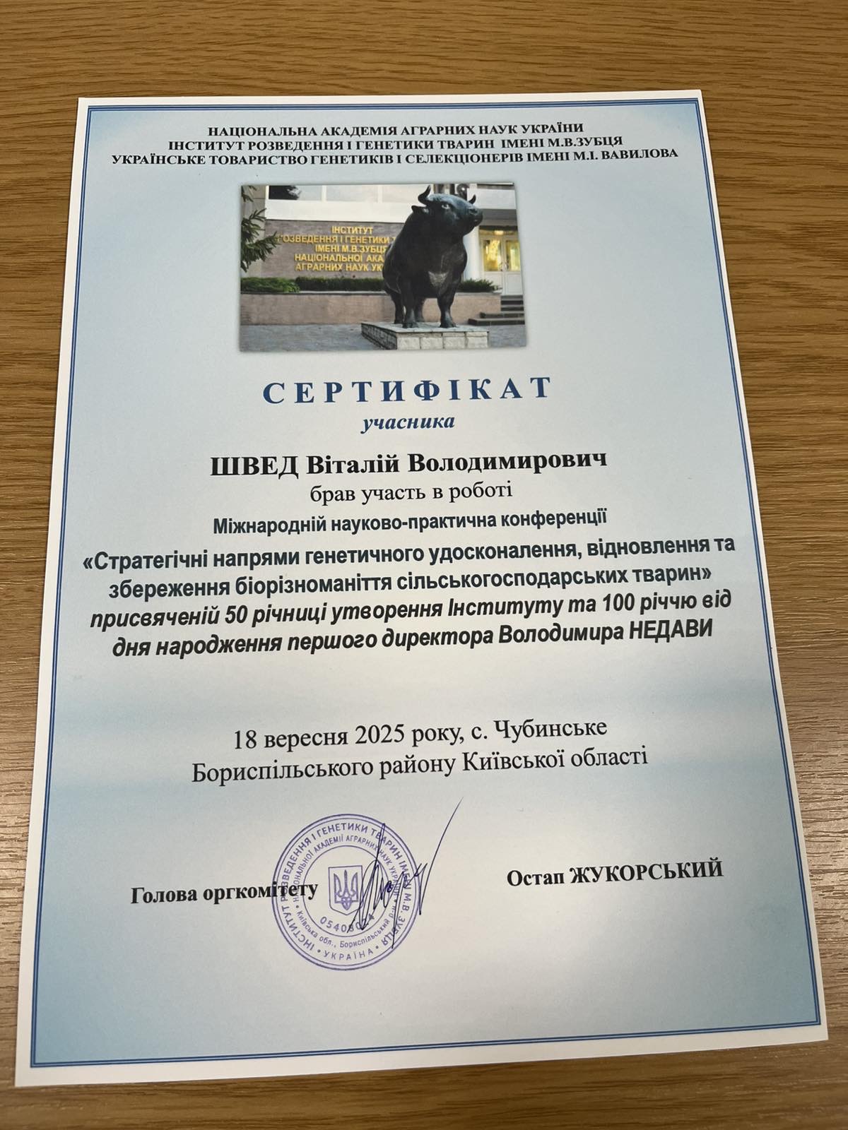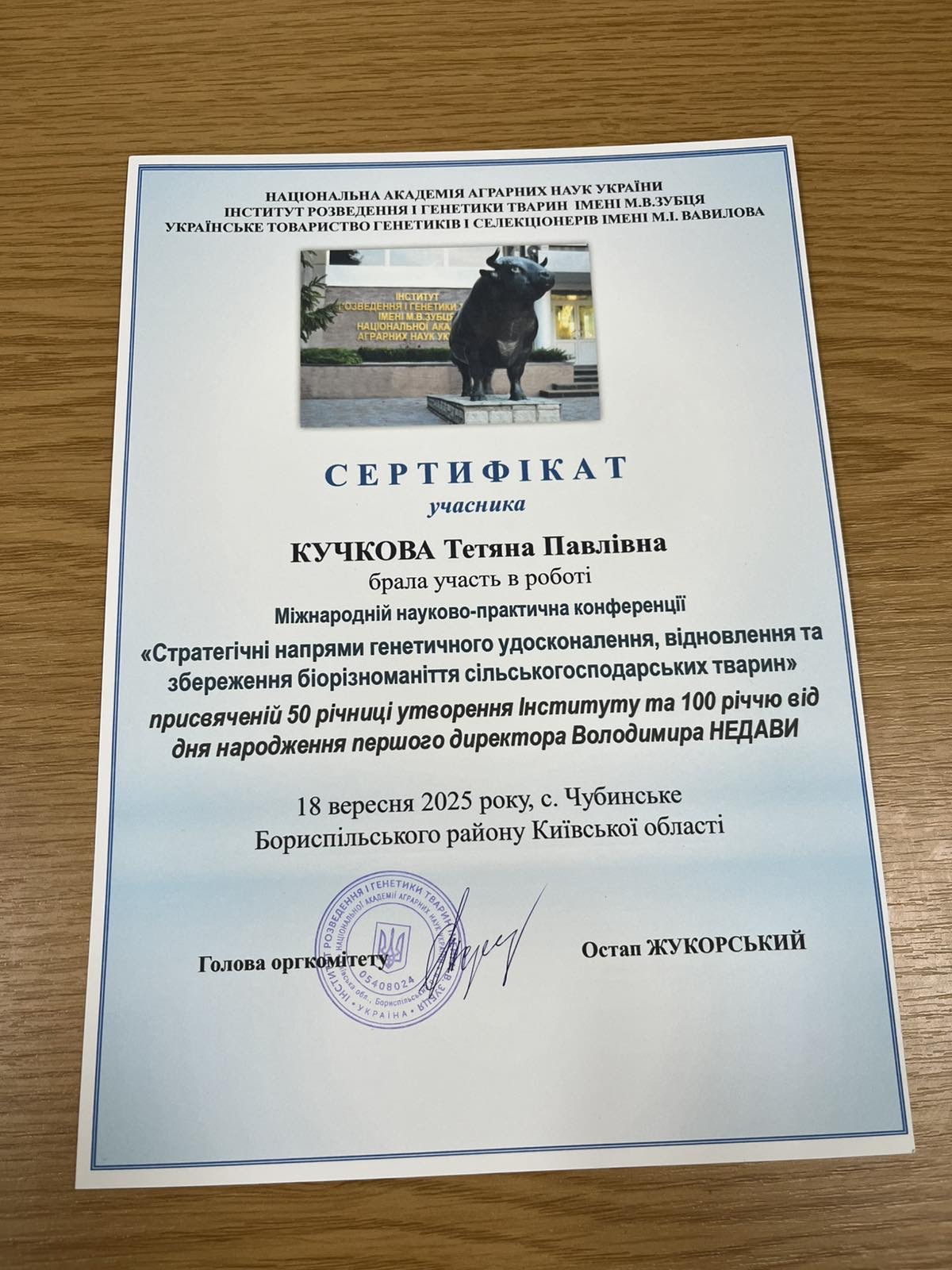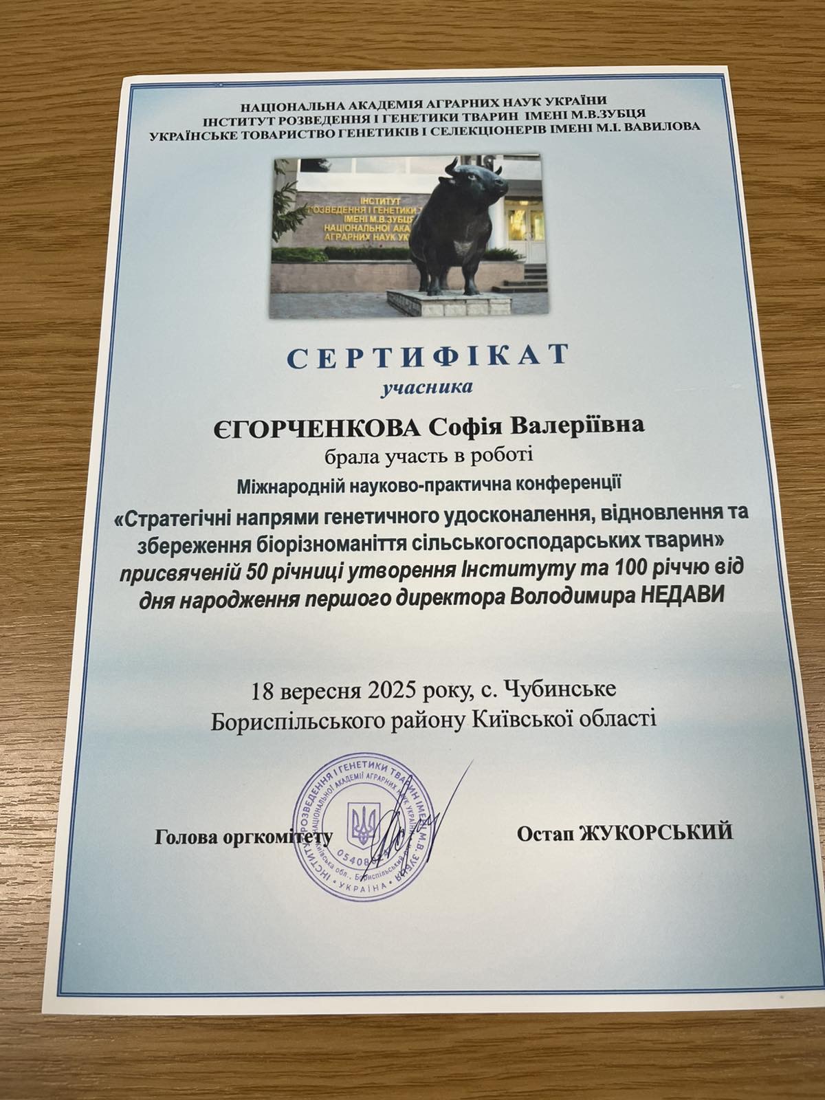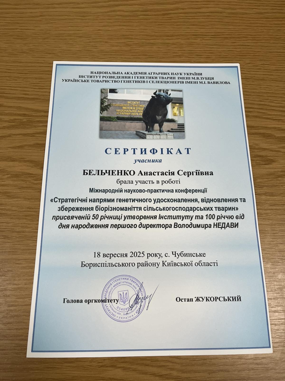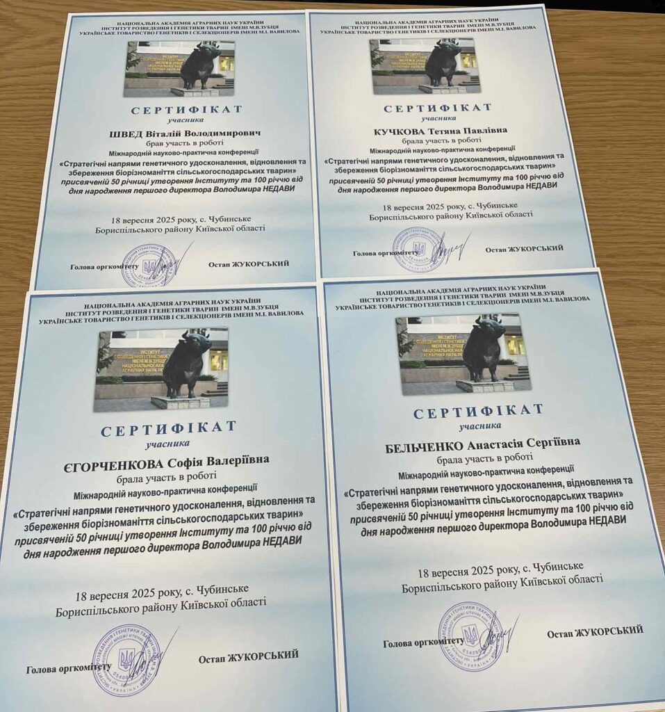 18 вересня 2025 року аспіранти біолого-технологічного факультету — Анастасія Бельченко, Віталій Швед, Софія Єгорченкова та Тетяна Кучкова — взяли участь у роботі Міжнародної науково-практичної конференції «Стратегічні напрямки генетичного удосконалення, відновлення та збереження біорізноманіття сільськогосподарських тварин», що відбулася у селі Чубинське Бориспільського району Київської області.