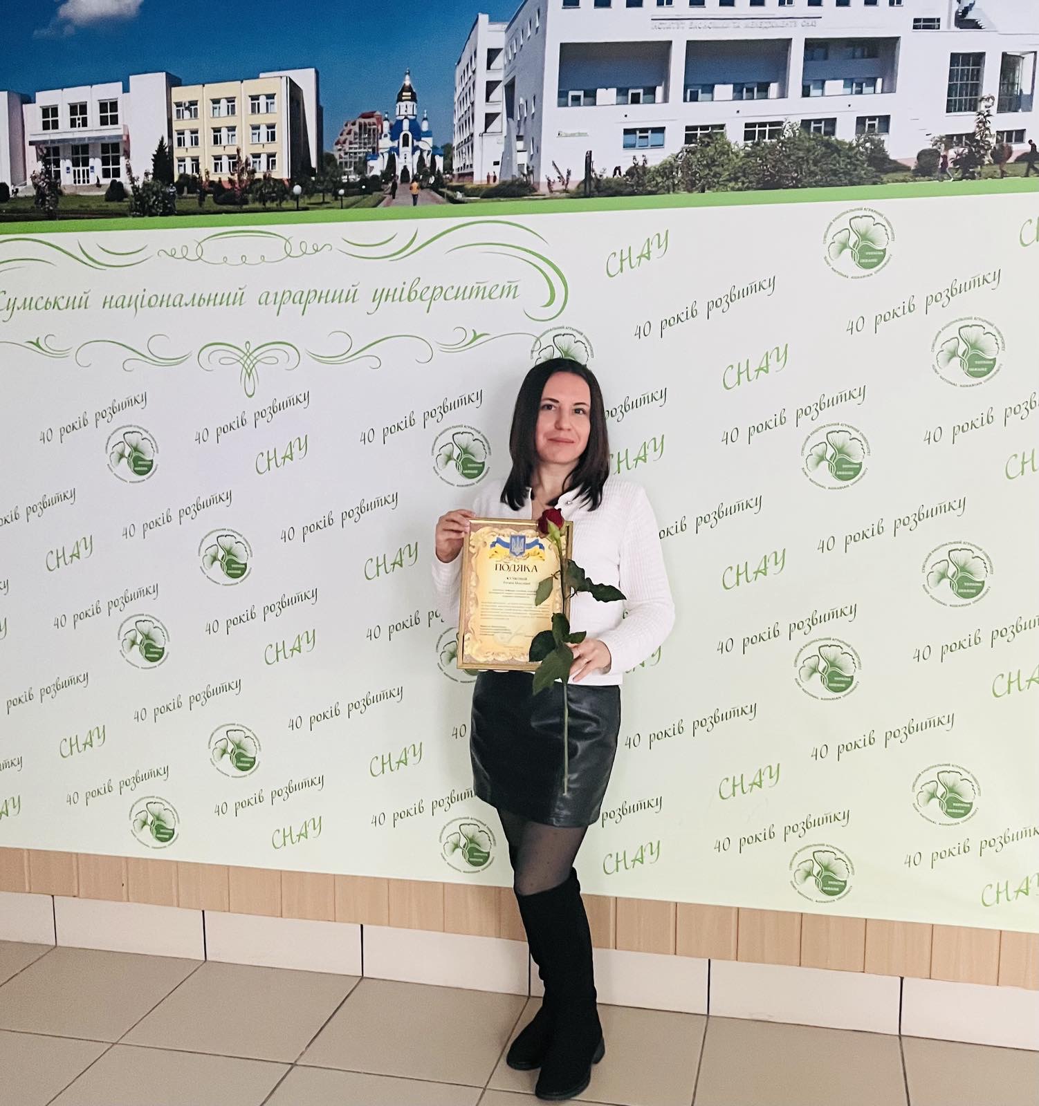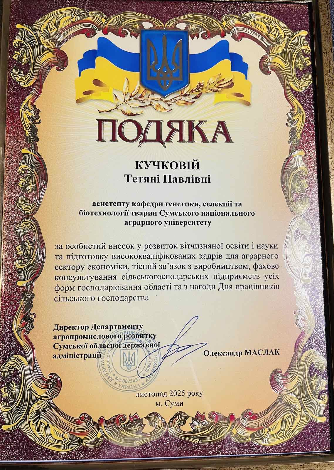 До Дня працівника сільського господарства аспірантка кафедри генетики, селекції та біотехнології тварин Тетяна Кучкова отримала почесну грамоту від керівника департаменту агропромислового розвитку Сумської ОДА.