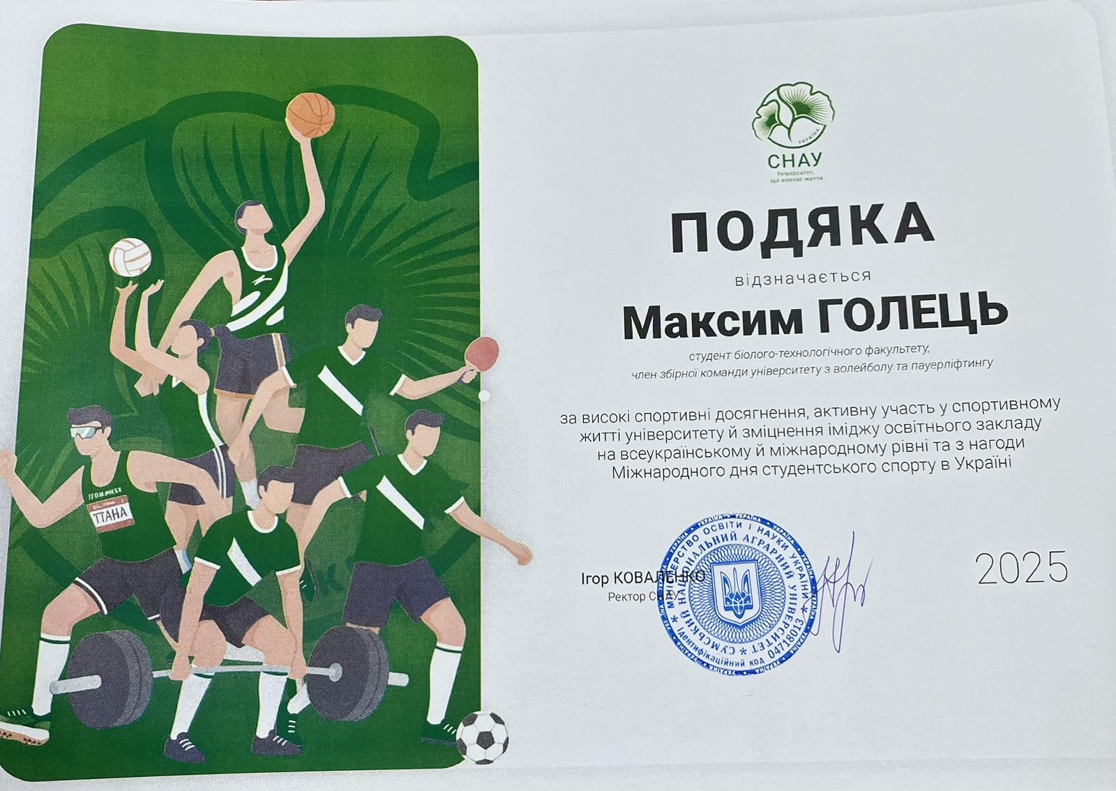 • Максим ГОЛЕЦЬ, студент 3 курсу, групи 2302-1 – за успіхи у волейболі та пауерліфтингу;