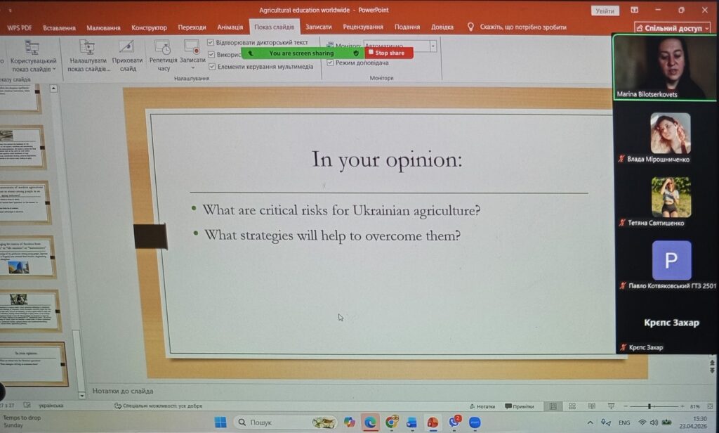 Під час засідання студенти пройшли квест на знання сучасних трендів в аграрній освіті та науці, які критичні ризики вони мають подолати, а також активно обговорювали наступні питання: