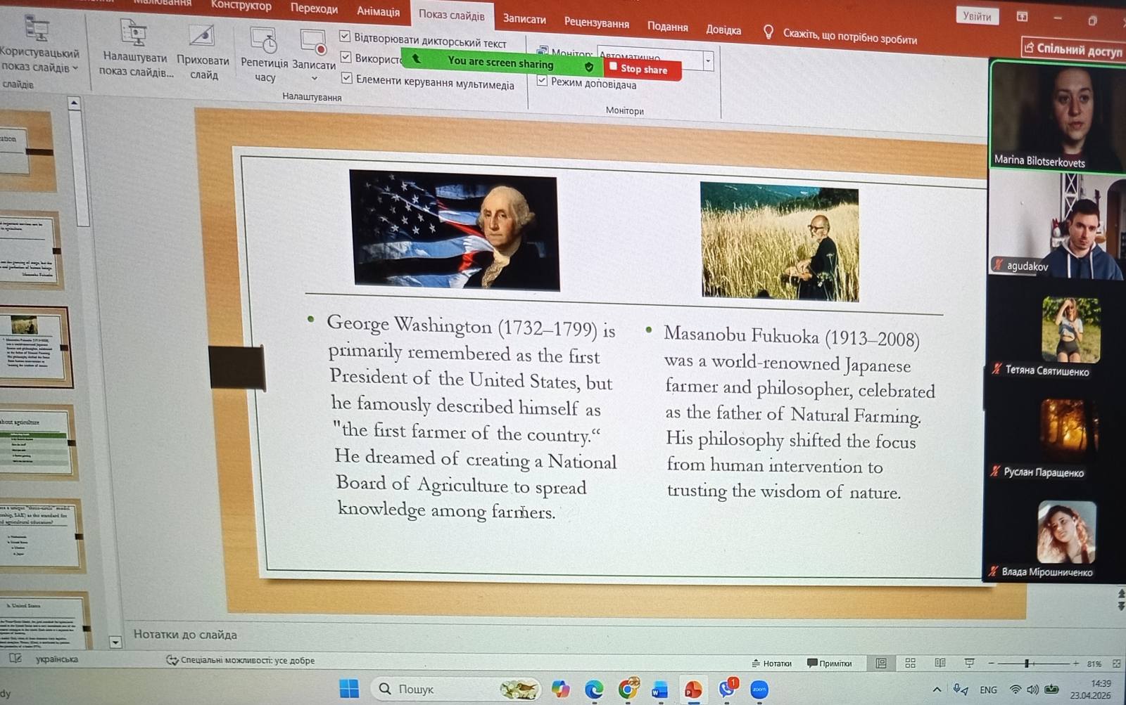 Учасники клубу дізналися про таких візіонерів і інноваторів аграрної освіти, як Джордж Вашінгтон і Масанобу Фукуока, як їхня філософія вплинула на створення Моделі трьох кіл, золотий стандарт сільськогосподарської освіти, що виник у Сполучених Штатах, та Розумне сільське господарство в Японії, унікальну модель, де передові технології покликані вирішити проблеми гострої нестачі ресурсів.