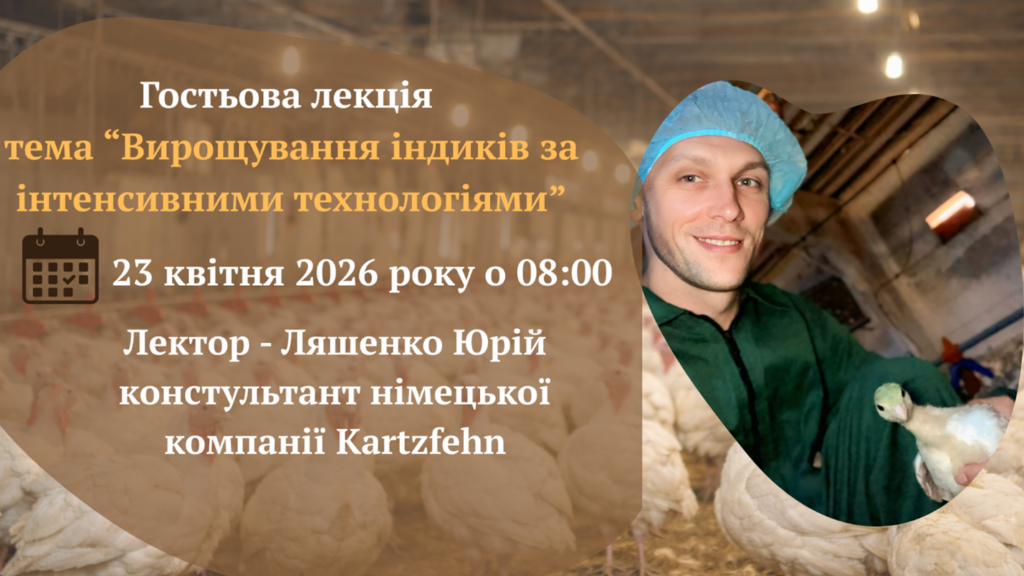 23 квітня 2026 року о 08:00 для здобувачі ОП «Технологія виробництва і переробки продукції тваринництва» СВО «Бакалавр» та «Магістр» буде проведена гостьова лекція на тему «Вирощування індиків за інтенсивними технологіями».