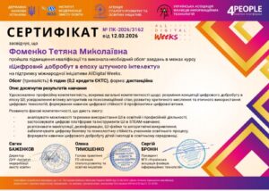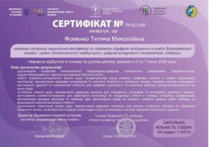 - Цифрові інструменти в освіті. Цей блок присвячений практичному застосуванню передових технологій для підвищення ефективності навчання, викладання та професійної продуктивності (опанування інструментів на базі AI для генерації контенту, персоналізації завдань; використання гейміфікації та спеціалізованих платформ; кібербезпека та цифрова гігієна, методики запобігання цифровому вигоранню).