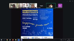 5-7 січня 2026 року доцент кафедри іноземних мов СНАУ Тетяна ФОМЕНКО взяла участь (дистанційно) у Всеукраїнській зимовій школі «Компетентності майбутнього: цифрові інструменти і психологічна стійкість».