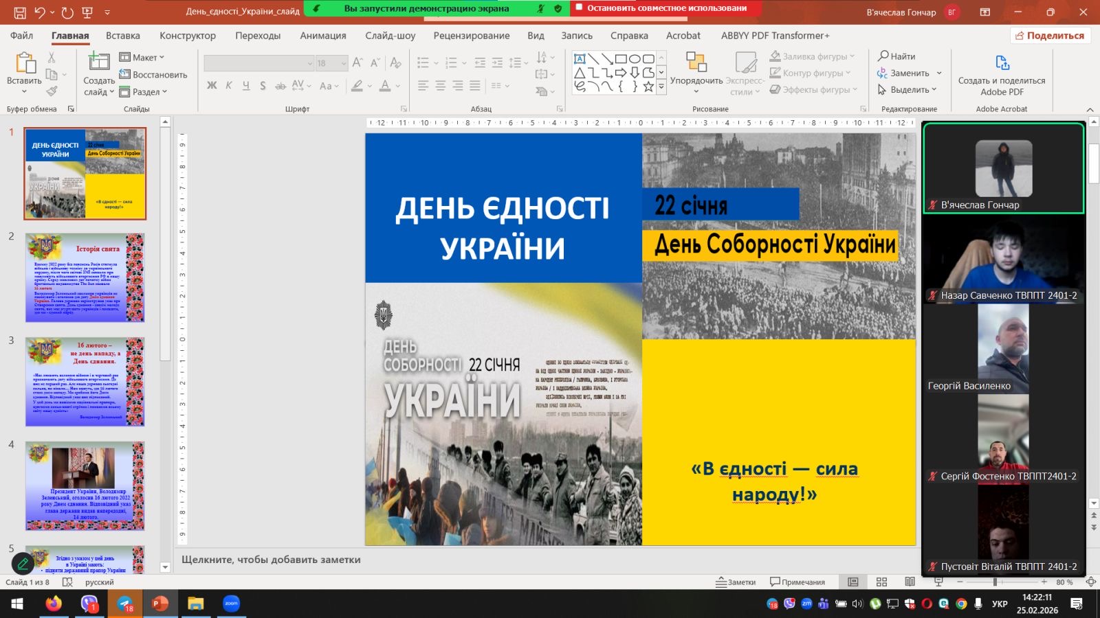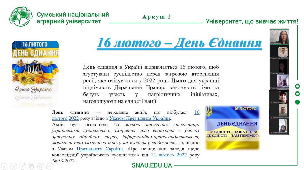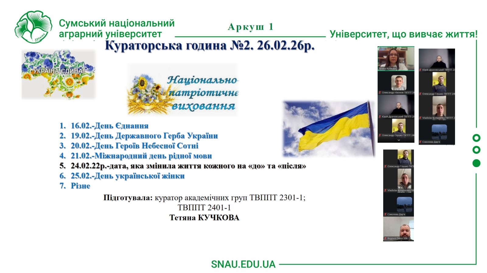 Протягом лютого на біолого-технологічному факультеті було проведено цикл кураторських годин, присвячених знаковим датам української історії та державності. Особливо насиченими стали останні два тижні місяця, які об’єднали студентську молодь навколо тем єдності, національної гідності та історичної пам’яті.