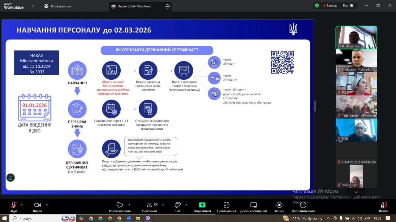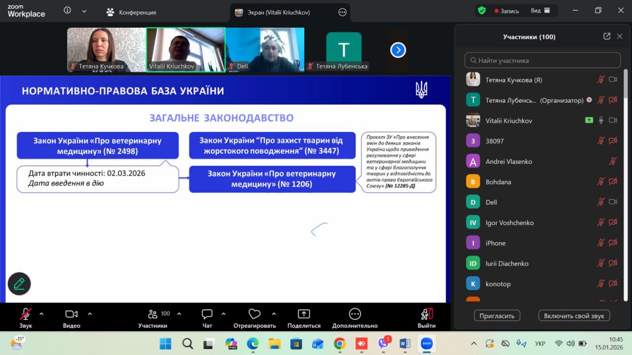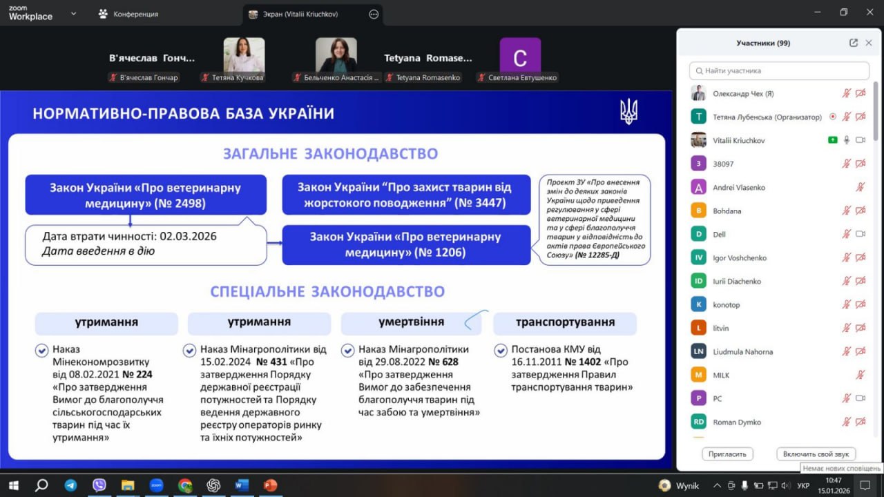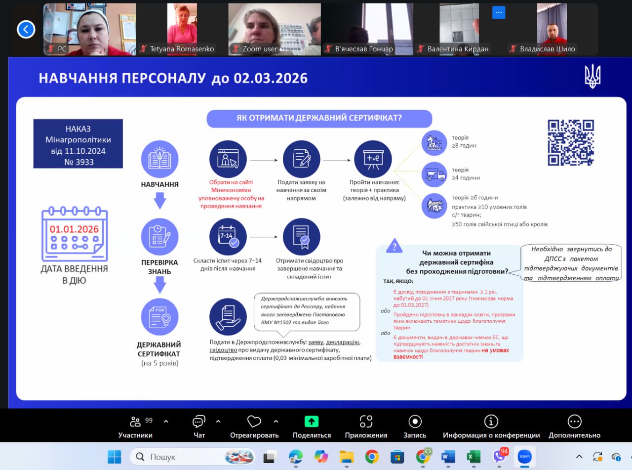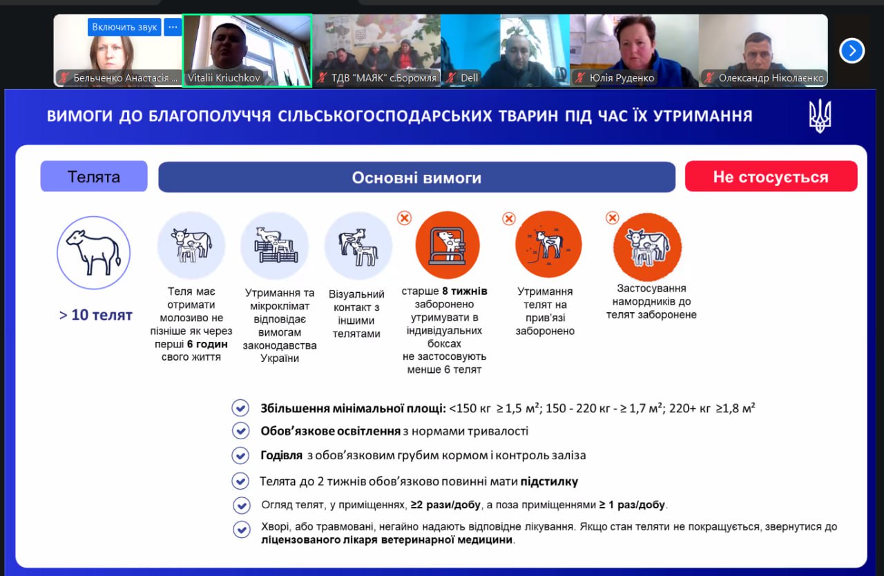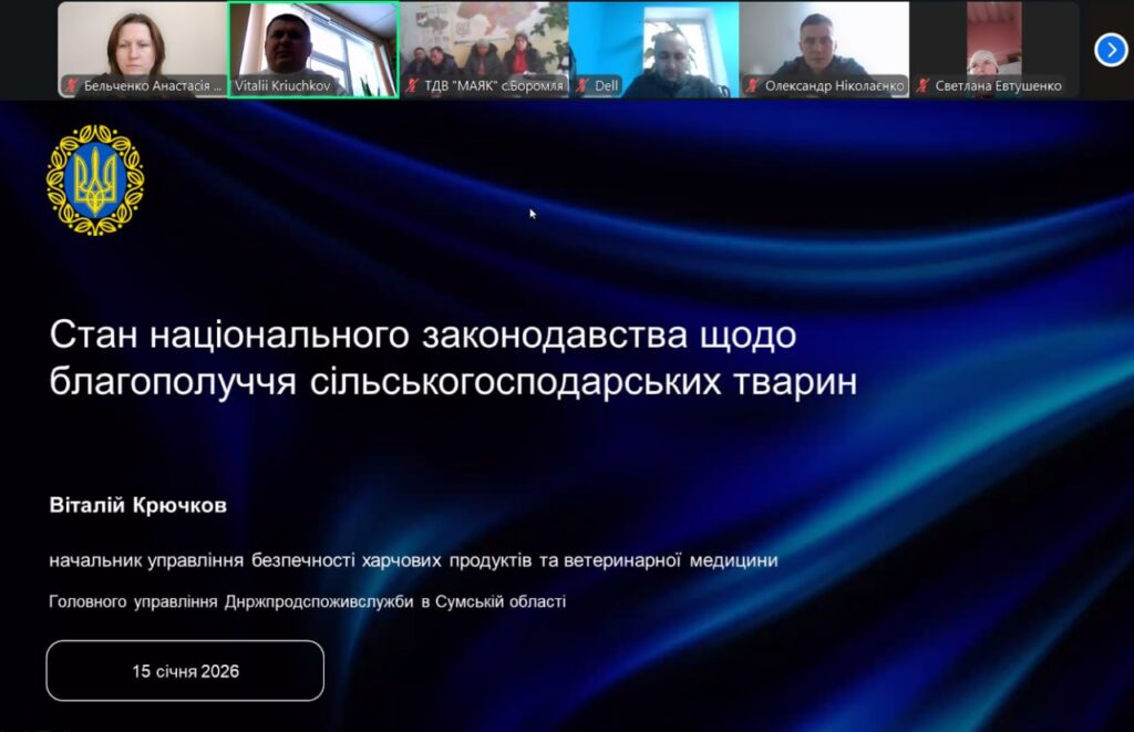 Серед спікерів вебінару — фахівці управління безпечності харчових продуктів та ветеринарної медицини Головного управління Держпродспоживслужби в Сумській області, які представили актуальні положення національного законодавства у сфері благополуччя тварин.
