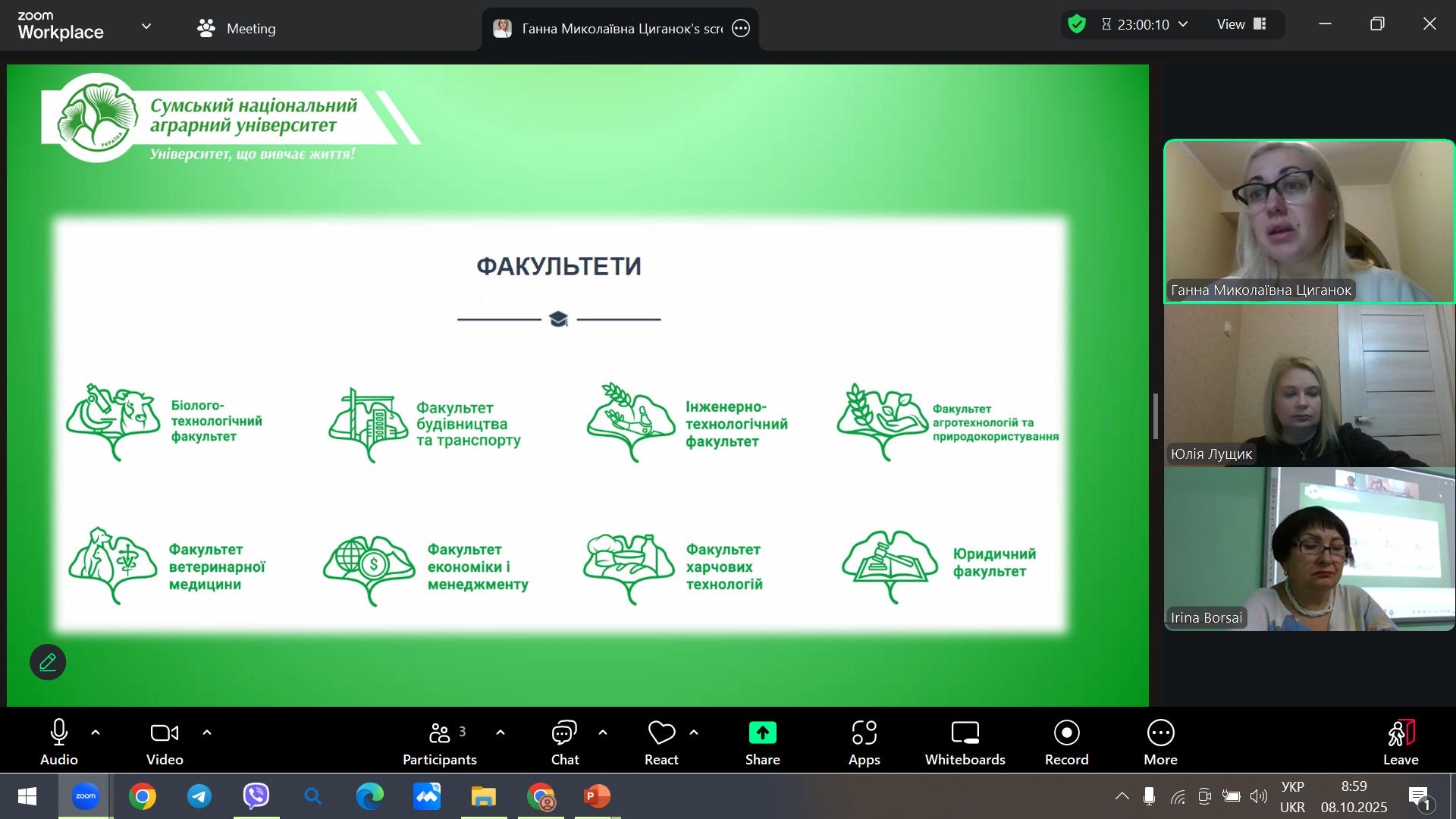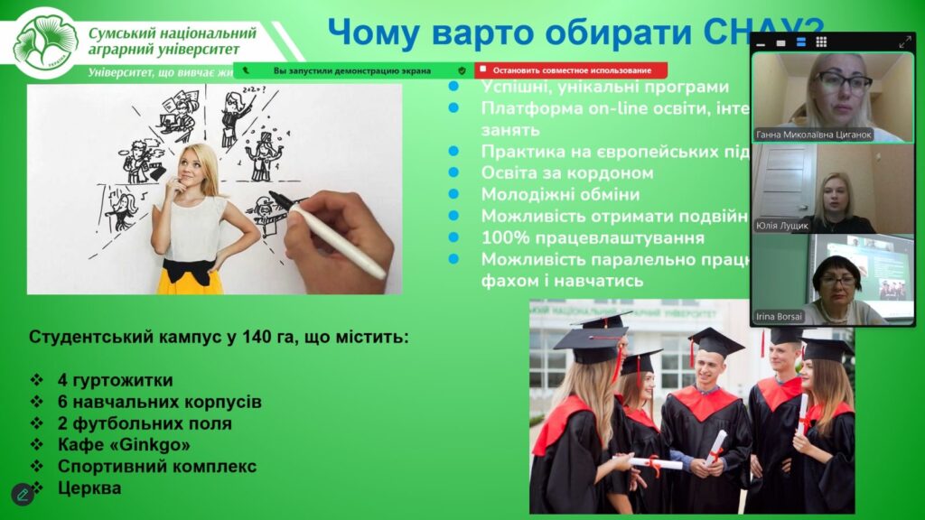 З метою ознайомлення старшокласників Буринського міського ліцею №2 імені Ю.М. Лавошника із можливостями подальшого навчання та особливостями студентського життя у Сумському національному аграрному університеті 08.10.2025 відбулася онлайн зустріч доцентів кафедри іноземних мов біолого-технологічного факультету Ганни Циганок та Юлії Лущик з учнями 11-го класу.