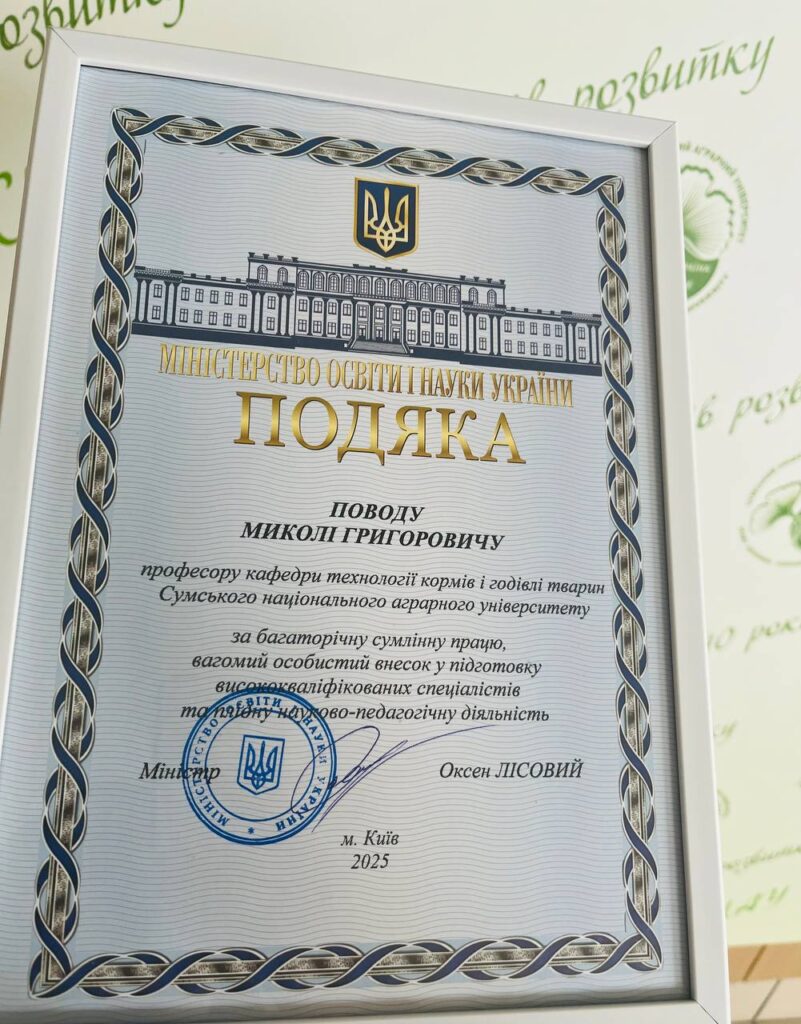 27.08.25р. під час святкової Вченої ради у Сумському національному аграрному університеті було відзначено Повода Миколу Григоровича, професора кафедри технології кормів і годівлі тварин Подякою Міністерства освіти і науки України. Нагороду вручено за багаторічну сумлінну працю, вагомий особистий внесок у підготовку висококваліфікованих спеціалістів та плідну науково-педагогічну діяльність.