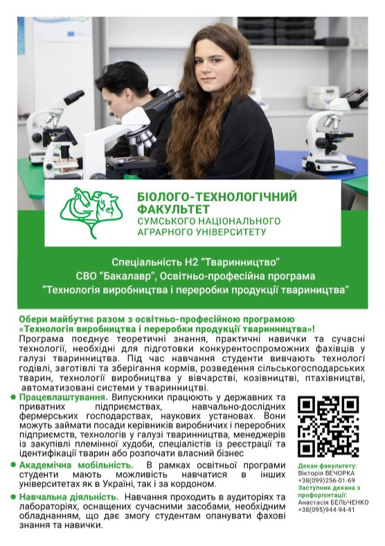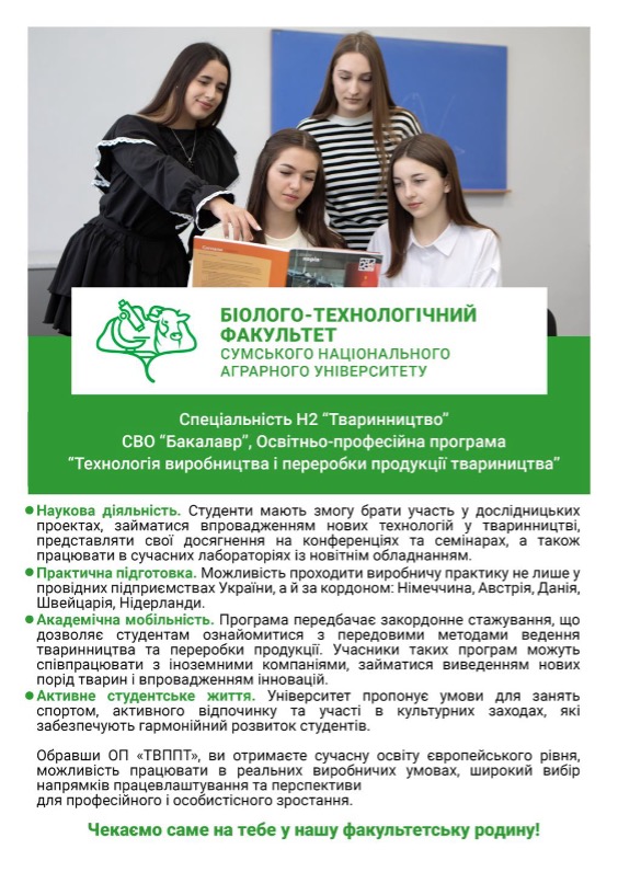 Нещодавно науково-педагогічні працівники біолого-технологічного факультету провели профорієнтаційний захід для учнів старших класів ЗОШ №20, м. Суми. Метою зустрічі було ознайомлення майбутніх абітурієнтів із особливостями навчання, перспективами професійного розвитку та перевагами здобуття освіти у галузі тваринництва.