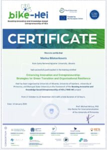 Викладачі Сумського національного аграрного університету взяли участь у міжнародному навчанні в межах проєкту BIKE-HEI (Boosting Innovative and Knowledge-based Entrepreneurship of HEIs), що реалізується за підтримки Європейського Союзу та ініціативи EIT Higher Education. Програма була присвячена посиленню інноваційного потенціалу закладів вищої освіти, стратегіям зеленого переходу та організаційній стійкості. Участь у проєкті сприяє впровадженню європейського досвіду, розвитку підприємницького мислення та зміцненню міжнародної співпраці університету.