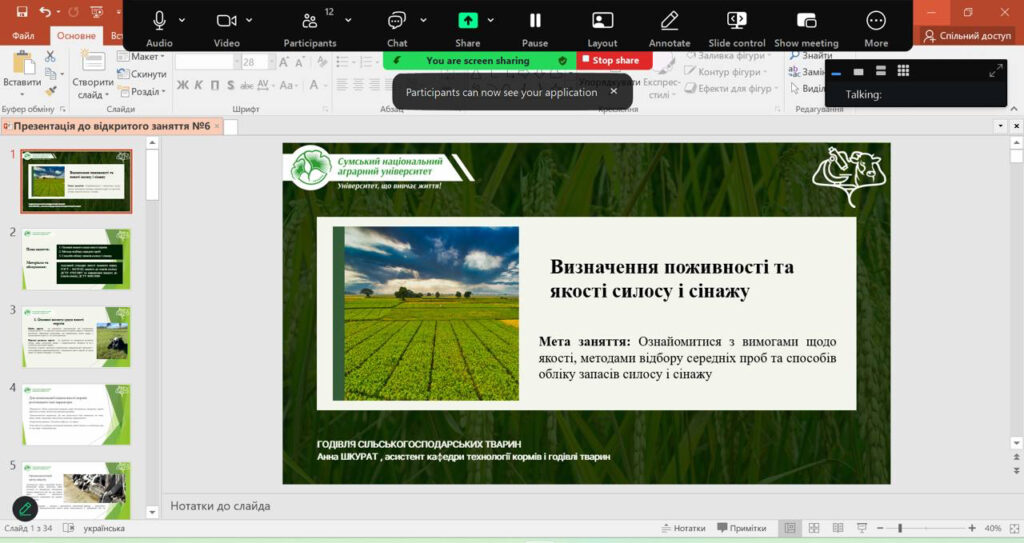 В процесі заняття, яке було представлене у вигляді презентації, використані елементи навчально-методичного комплексу дисципліни, галузеві стандарти якості зеленого корму, нормативні вимоги до класів силосу та сінажу, фото та відеоматеріали.