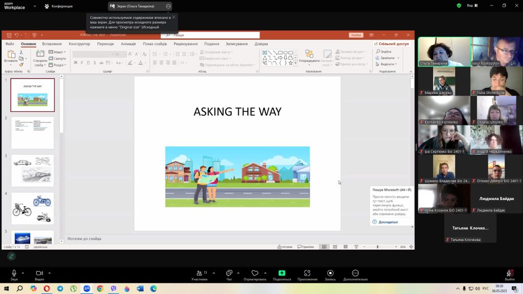 06 травня 2025 року на кафедрі іноземних мов відбулось відкрите заняття з дисципліни «Іноземна мова» доцента кафедри Тамаркіної О.Л. Заняття проводилось в групі БІО 2401-1, тема заняття «You can’t miss it. Asking the way».